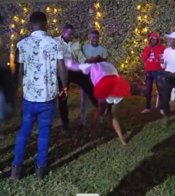 At some point, the businessman drags Bella out of the view of cameras as a female voice is heard asking, “Mbona mnaachilia dame achapwe?”